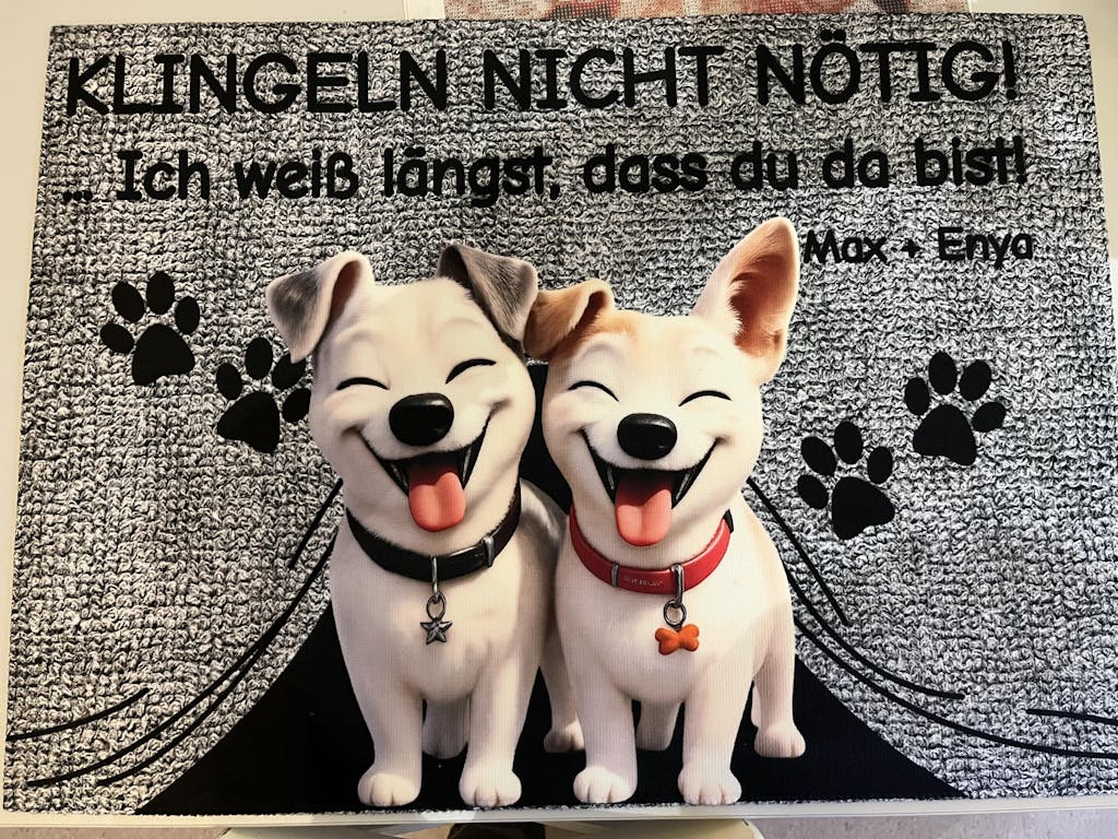 Die Fußmatte ist der Hammer. Groß, grandios, tolle Qualität und der Text passt zu unserem Hund wie die Faust auf das Auge. Denn bevor jemand klingelt weiß unser Rex schon, dass jemand kommt.